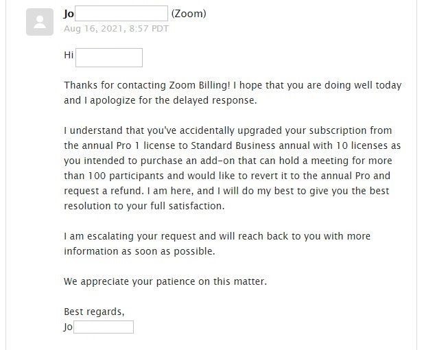 ZOOM에서 저의 환불 요청을 검토하여 다시 프로 단계로 하향 조정 작업을 이미 진행했고 제가 프로 등급에서 지금까지 사용했던 금액을 제외한 비용을 환불 처리하였다고 합니다. 3~5일 이내 저의 계정에 반영한다고 하고요.